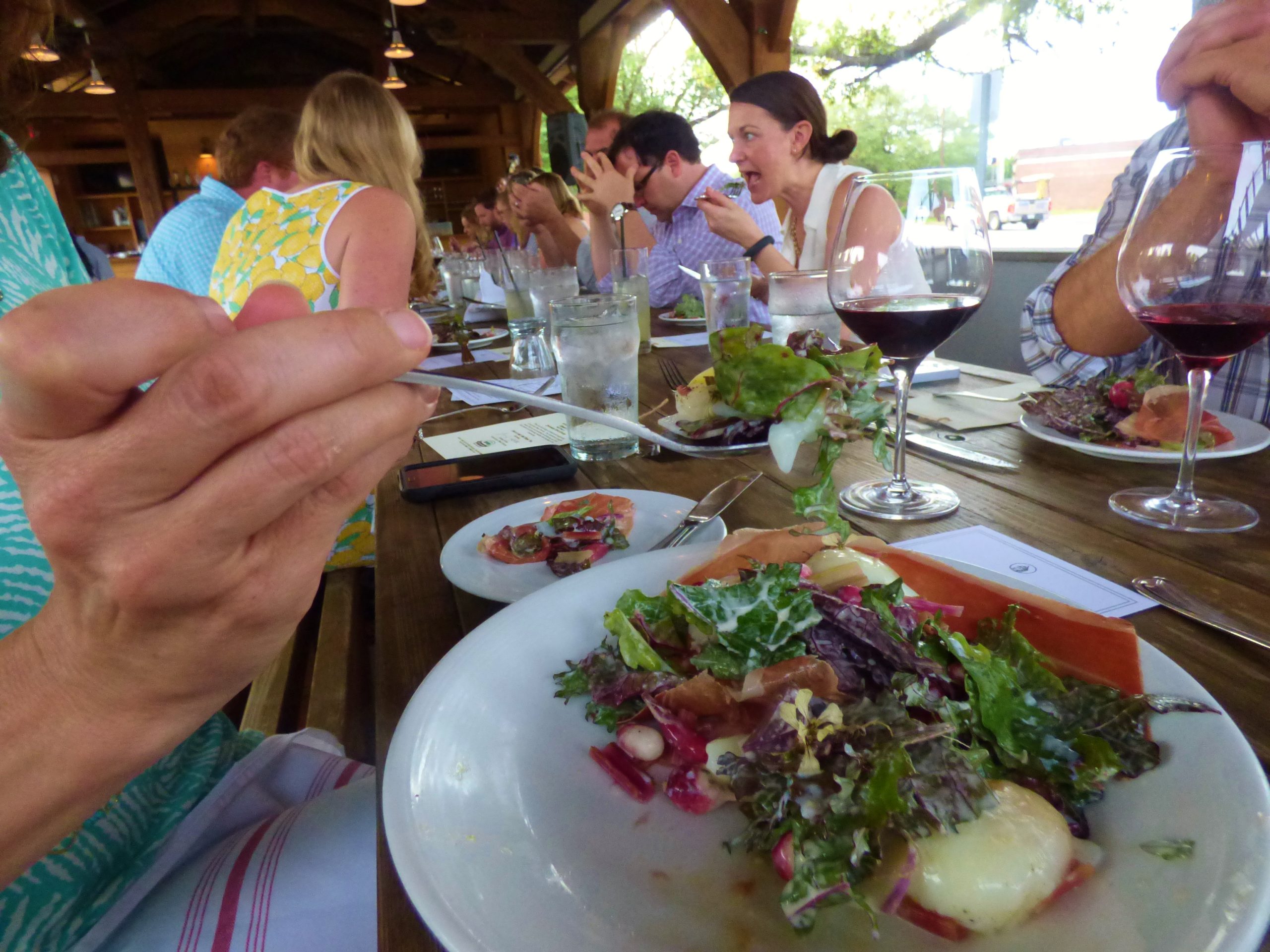 The late spring salad last night from LowCountry Street Grocery and Edmund’s Oast had soft eggs on top and country ham nestled below. The hearty green mix was perfectly accented by small pieces of chopped rhubarb. They gave the salad a subtle sweetness that you might usually use apples or beets to achieve. You also get the additional crunchy quality that you traditionally might have gotten from celery. What a colorful, unique element to add to your spring salad rhubarb proved to be. I bet you’ll love it as much as we all did last night.