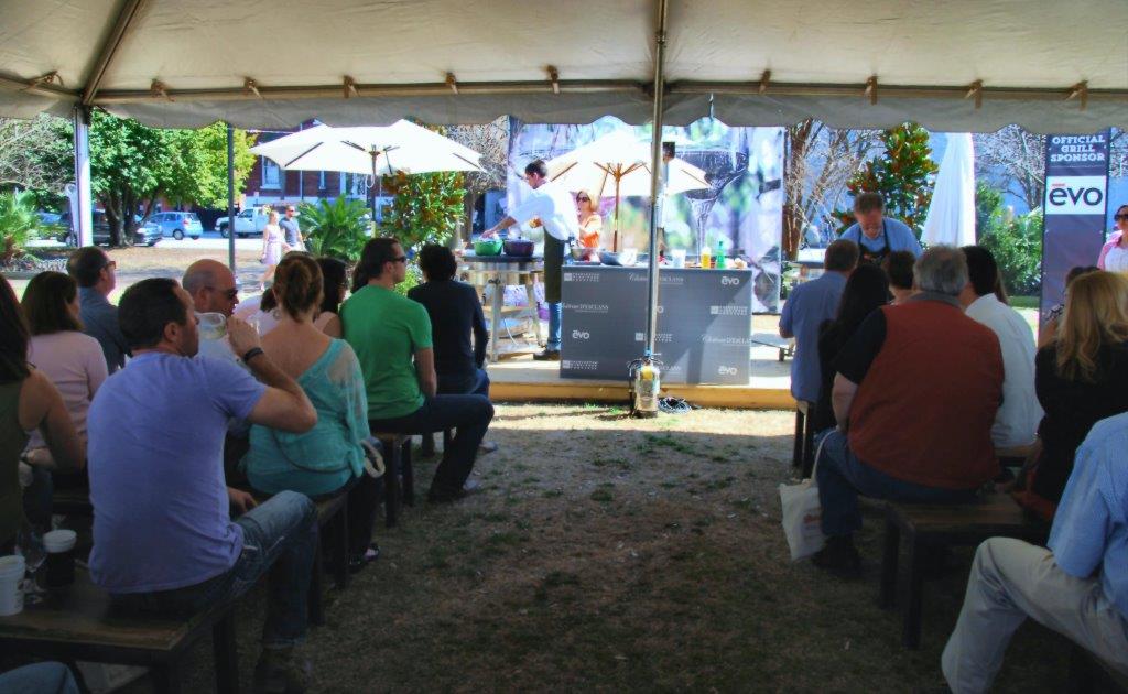 And so I knew there was no better place to begin our dialogue than with this featured dish of Creole oysters. It is from one of demos last weekend at the BB&T Charleston Wine and Food Festival sponsored by Evo Grills, outdoorLUX, and Chateau D’Esclans. The festival had begun last Friday in a bitter, cold rain with gray skies over our heads and thick mud under our booted feet. Chefs that first day struggled to draw a resilient crowd into the open air tent with even the finest of ingredients and highest level of talent. But then we awoke on Saturday to crystal blue skies and clean Carolina sunshine.