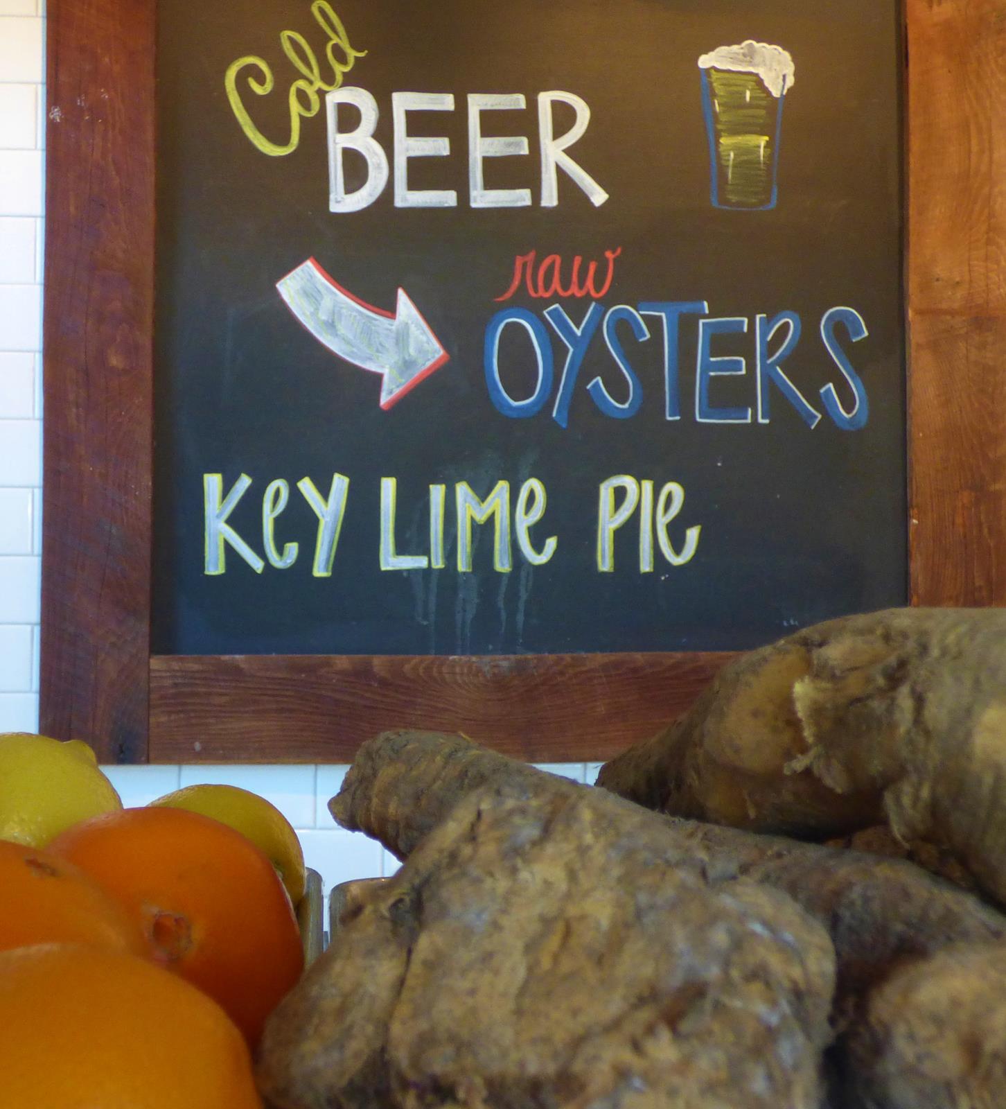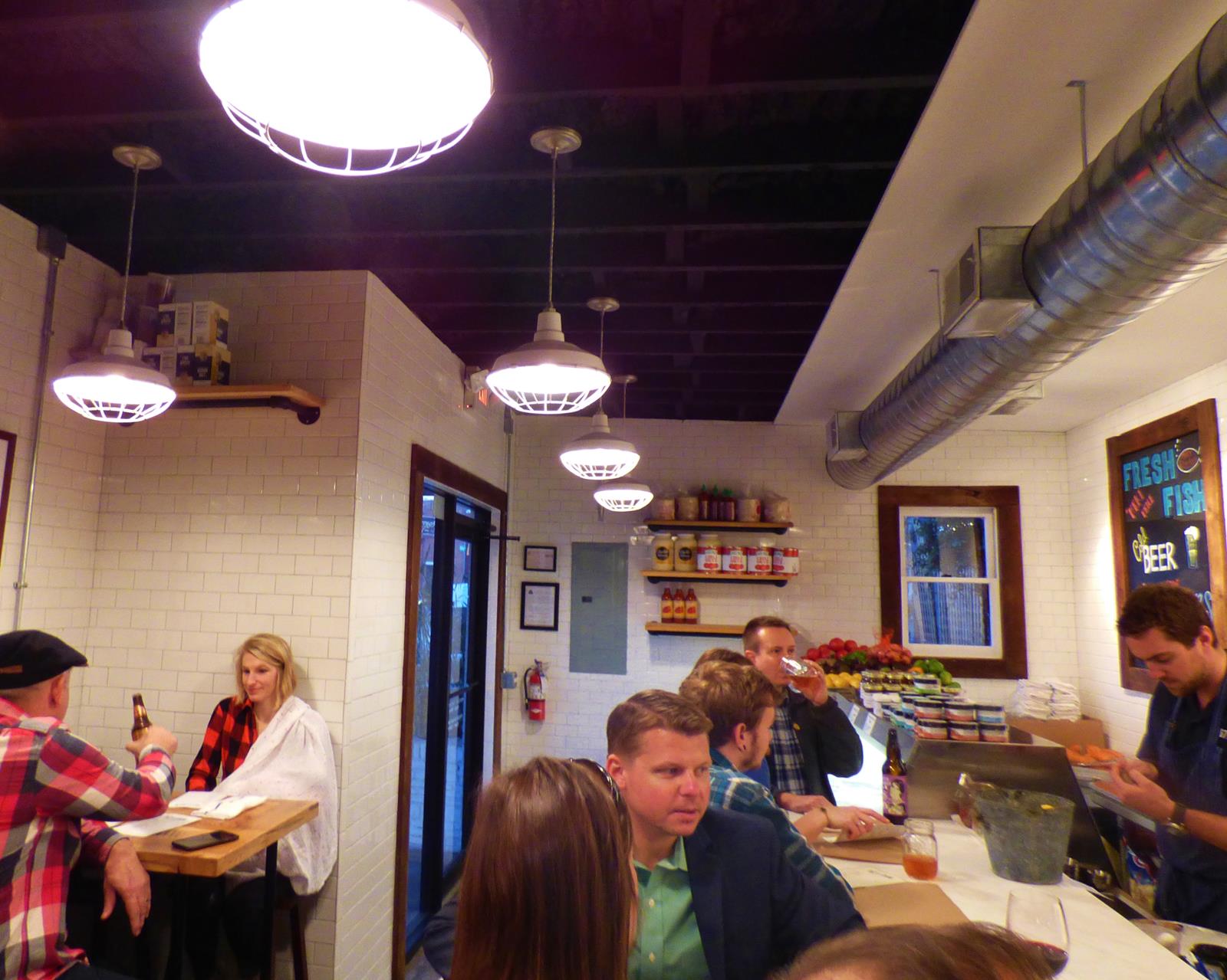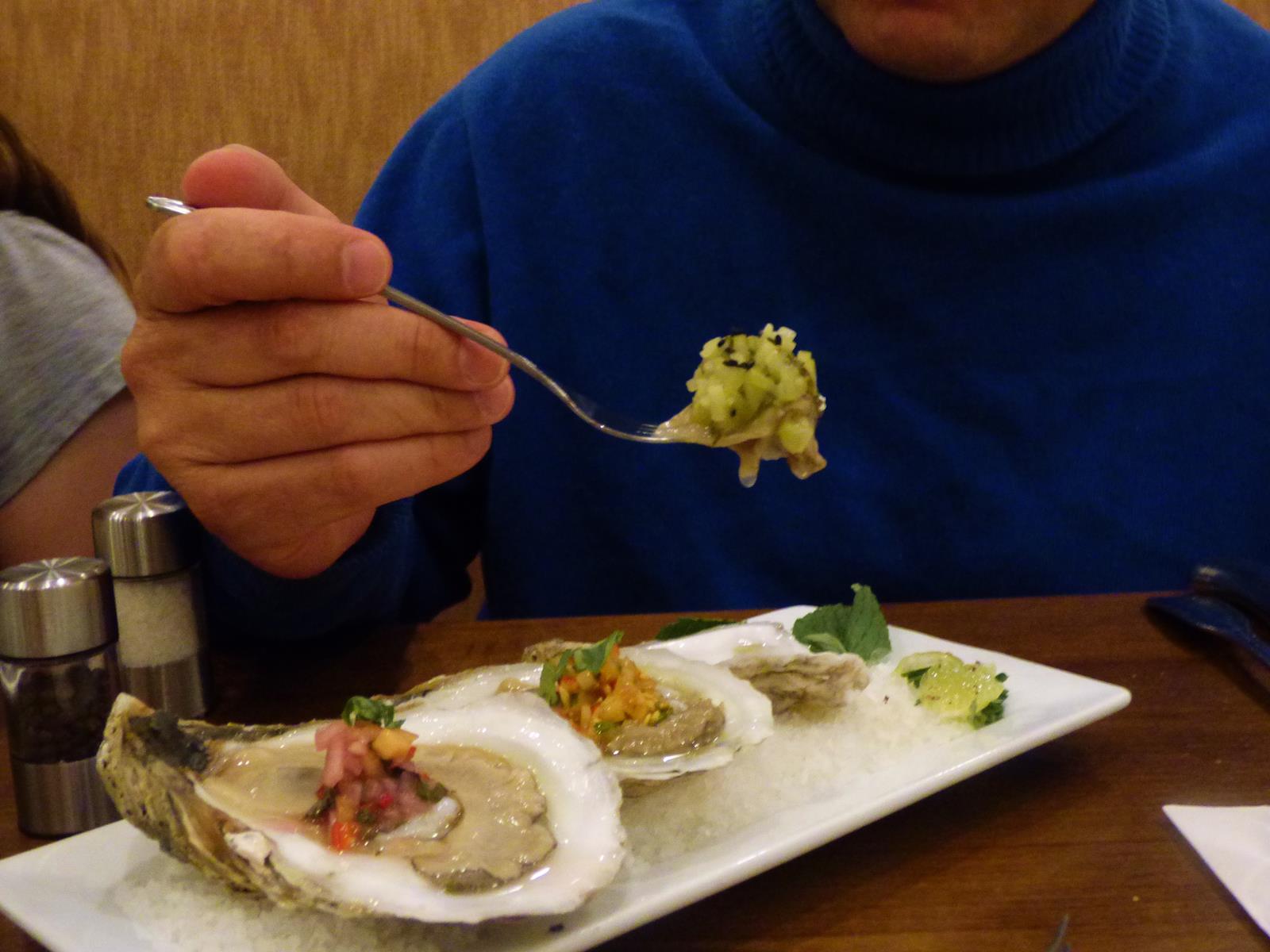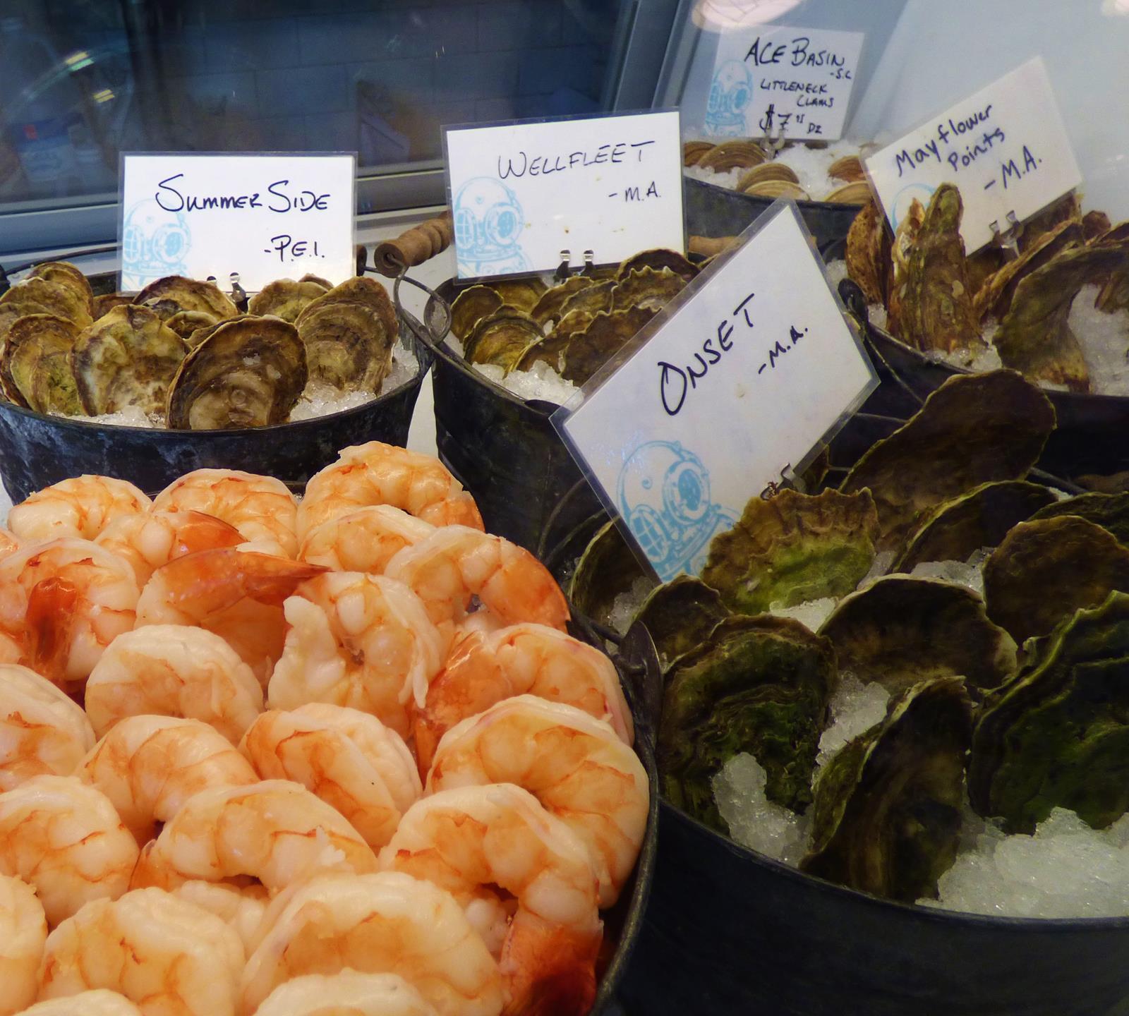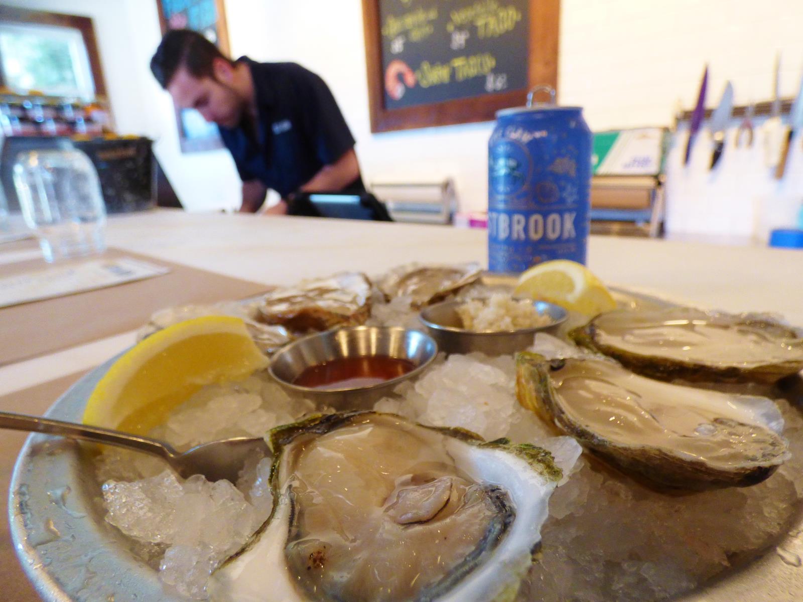 Serious happy slurping followed. Cocktail sauce is served only on request here (do try at least one without it). The house mignonette was classic. And Kyle even hooked me up with a little of his shaved frozen mignonette. It gave a beautiful icy flavor without watering down the bivalves. My taco came out hot and fresh with a good quantity of crispy oysters and fresh slasa and guacamole. Delicious. I could go broke hanging out here (and that’s at a reasonable $2.50 a oyster). All the seafood in the display case varies and is available to bring home with you as well. In fact, the original business plan was to primarly be a market which served a little food. The menu just was so popular they had to put in more seats to meet the demand. It’s that good. I enjoyed both the Mayflower Points and the Onsets. I especially liked the shaved frozen mignonette – it was an option I’d love to see always available on the menu. A couple of days later I went in at happy hour when oysters and clams are half priced. They had a completely different selection of oysters to choose from (so great right?).