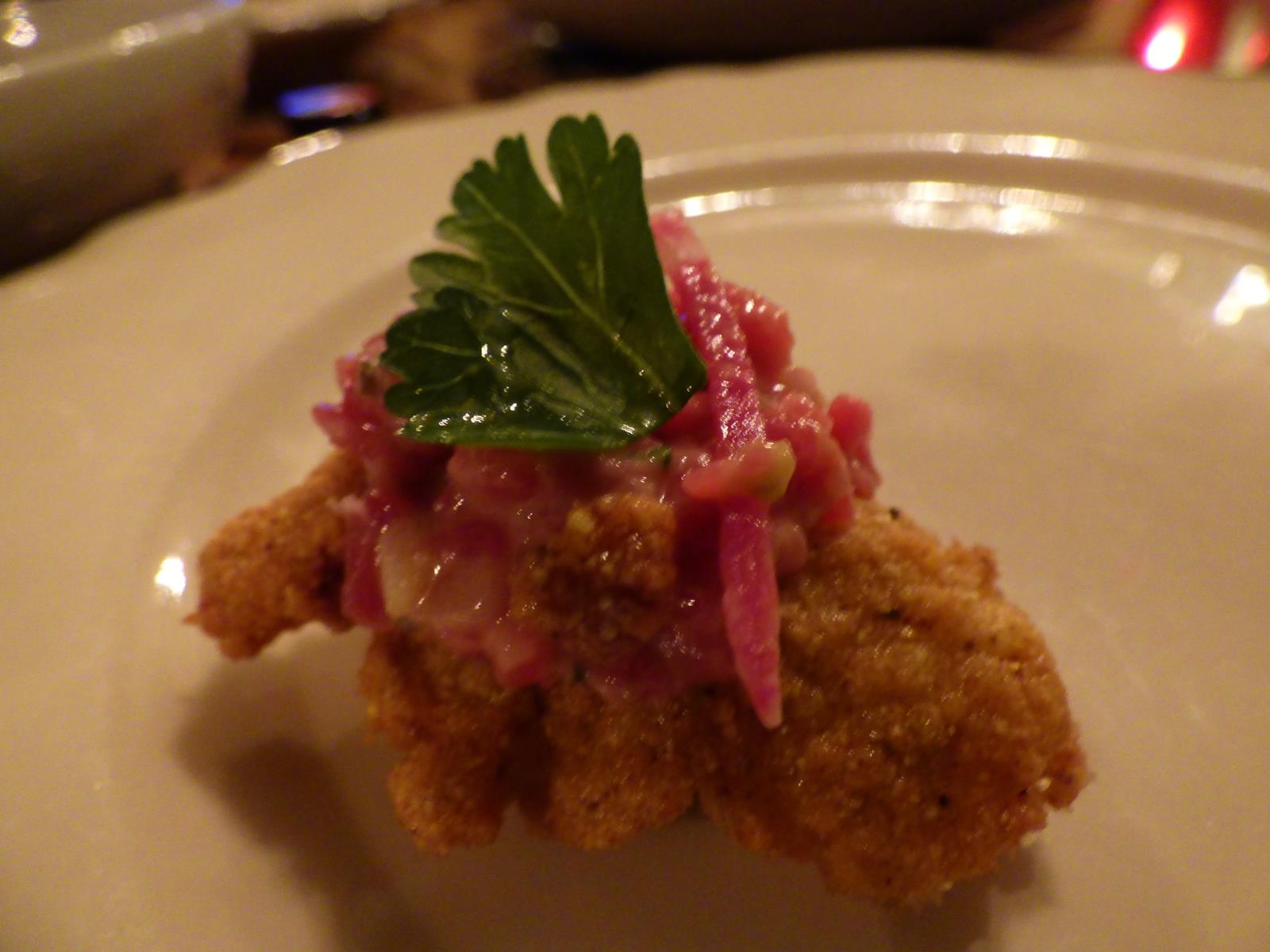 The Ordinary does offer a fun selection of sauces with a creative twist with their raw oysters. But the truth is, though I tried the delicious sauces, I found the delicate oysters were best with a small squeeze of lemon and shred of fresh horseradish. Some may say that even that was gilding the lily. Next we tried a couple of the oyster shooters. Half shells topped with cucumber water then served atop a shot of mango vodka sweetness. Good option for the first timer or fearful, but not our personal favorite of the night. Our talented and engaging server Brittany recommended we not miss the Fried Oysters with Beef Tartare. Thank you Brittany.