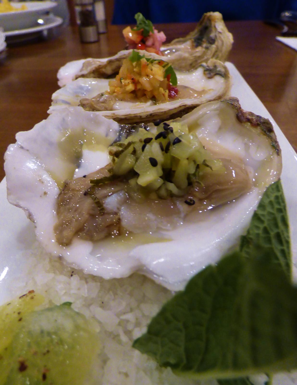 . I happen to have the joyful blessing of living on Daniel Island , SC (which is technically part of Charleston but does require bridge crossings to eat everywhere I’ve mentioned so far). Sometimes a girl just gets a craving for a dozen on a Tuesday night nad there is homework and basketball practice to consider. Until about a year ago, I just had to be patient and plan a night into town soon. But now that The Islander has opened a short bike ride from my house, that has all changed. The Islander is owned by the Holy City Hospitality Group that incudes downtown favorites like Rue de Jean, Coast, and Virginia’s on King. All of which serve some oysters. But here on island we are spoiled with a multitude of bivalve choices on The Islander menu. The Tuesday I was in Chef Whisenant was working with some nice sized Chesapeakes. You can order them in everything from their naked shells to a sushi soy wrap. We started with oysters 3 ways which showcased 3 toppings of fresh salsa. I favored the tropical which had a little thai chili kick.