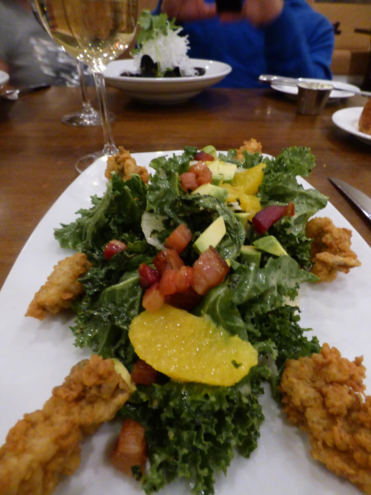 Then we ordered the baked oysters available in three styles as well. Bienville with shitakes and crabmeat, BBQ with fresh grated horseradish, and the ever popular Rockerfeller with spinach and parmesan. We decided to sample all and had different favorites among us. Next we got their beautiful roasted kale salad topped with crispy oysters. All the menu salads can be topped with oysters at The Islander. But the Local Kale with avocado, bacon lardons, and Chipotle Vinaigrette was a great match with the crispy oysters. The giant platter of fried oysters with jalapeno cole slaw and Rue De Jean famous frites is also a solid choice (and affordable at $16.99). Although this is my neighborhood resource for an oyster fix, I do encourage you to make the trip to our piece of paradise to enjoy this great spot. Stellar cocktails, open beachy atmosphere, and lots of fresh creative ways with seafood make it more than just a neighborhood place.