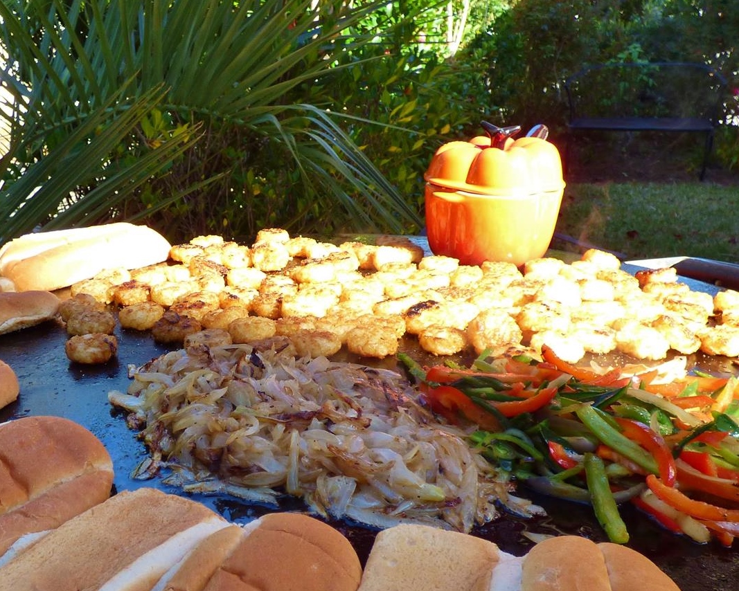Once the beef (or chicken) is on the grill it only takes about one minute on each side to sear off the beef perfectly. High heat, small pieces, and no crowding is crucial. Turn off evo grill ( or burner) and divide meat into sandwich sized piles. Top each with desired toppings (like onions and peppers )and a slice of cheese. Place roll over pile to melt cheese then pick up whole thing with a piece of folded heavy duty aluminium foil with splatula underneath assisting the lift. I like to serve from the grill and let guests help themselves to tots and a drizzle hot queso. Most go for it over the totos and sandwiches both. I like to add some jalapenos to my tots then drizzle. It’s a party after all. Tableside I put out chipotle mayo, jalapenos, and ketchup (for the tots) and lots of napkins. The foil helps out with containing the mess but even so… napkins will be needed.