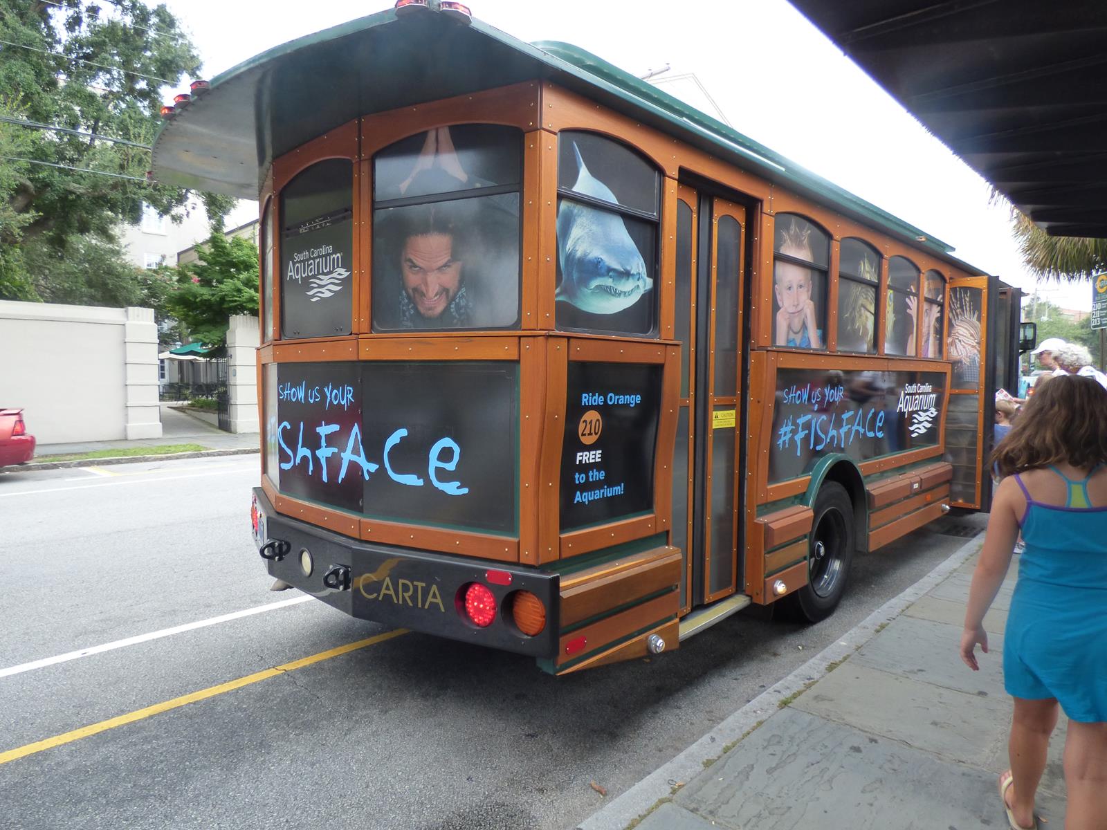 At this point we decided to enjoy a little window shopping and just taking in the scene of King St on a Saturday. It is a short walk back to the visitor center on John Street where we decide to catch the free Trolley ride back to the Aquarium. There is a covered bench to sit in the shade while you wait for the Orange Line trolley. It arrives every 12 minutes and delivers you back to the Aquarium in about 10 minutes, no charge. Two other routes offer great options for exploring different areas of downtown.