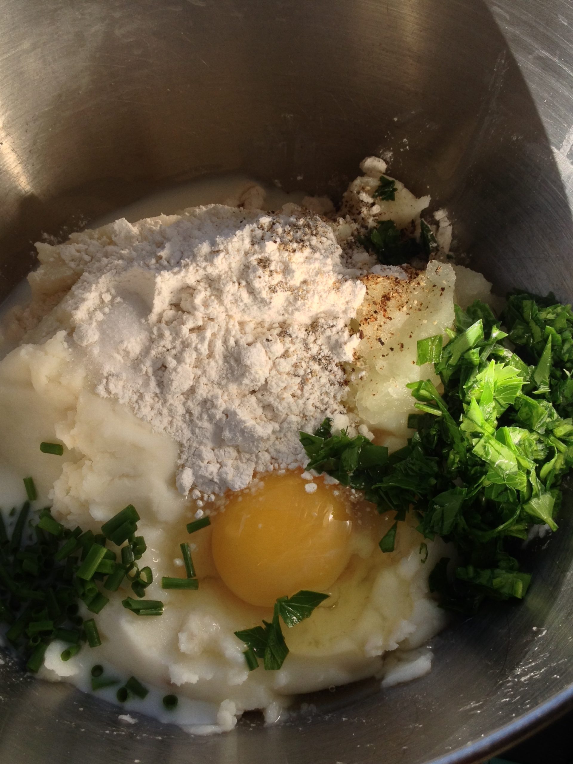 - 2/3 cup all-purpose flour (you may need more or less, depending on how dry or wet your mashed potatoes are)
