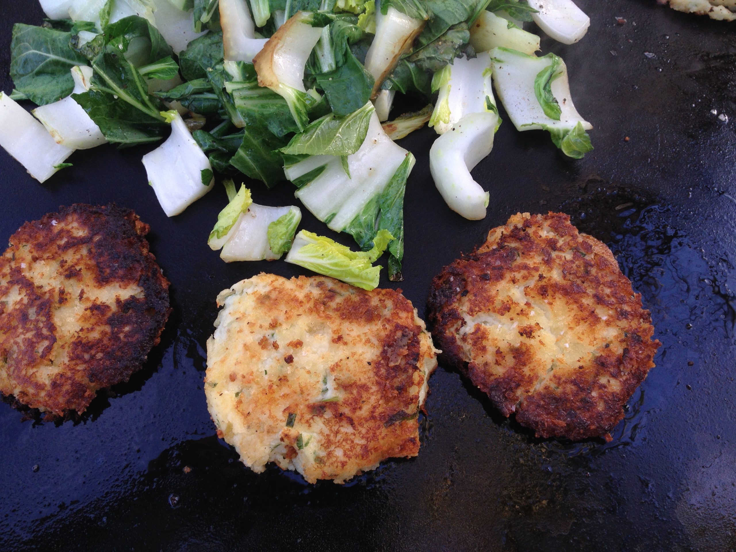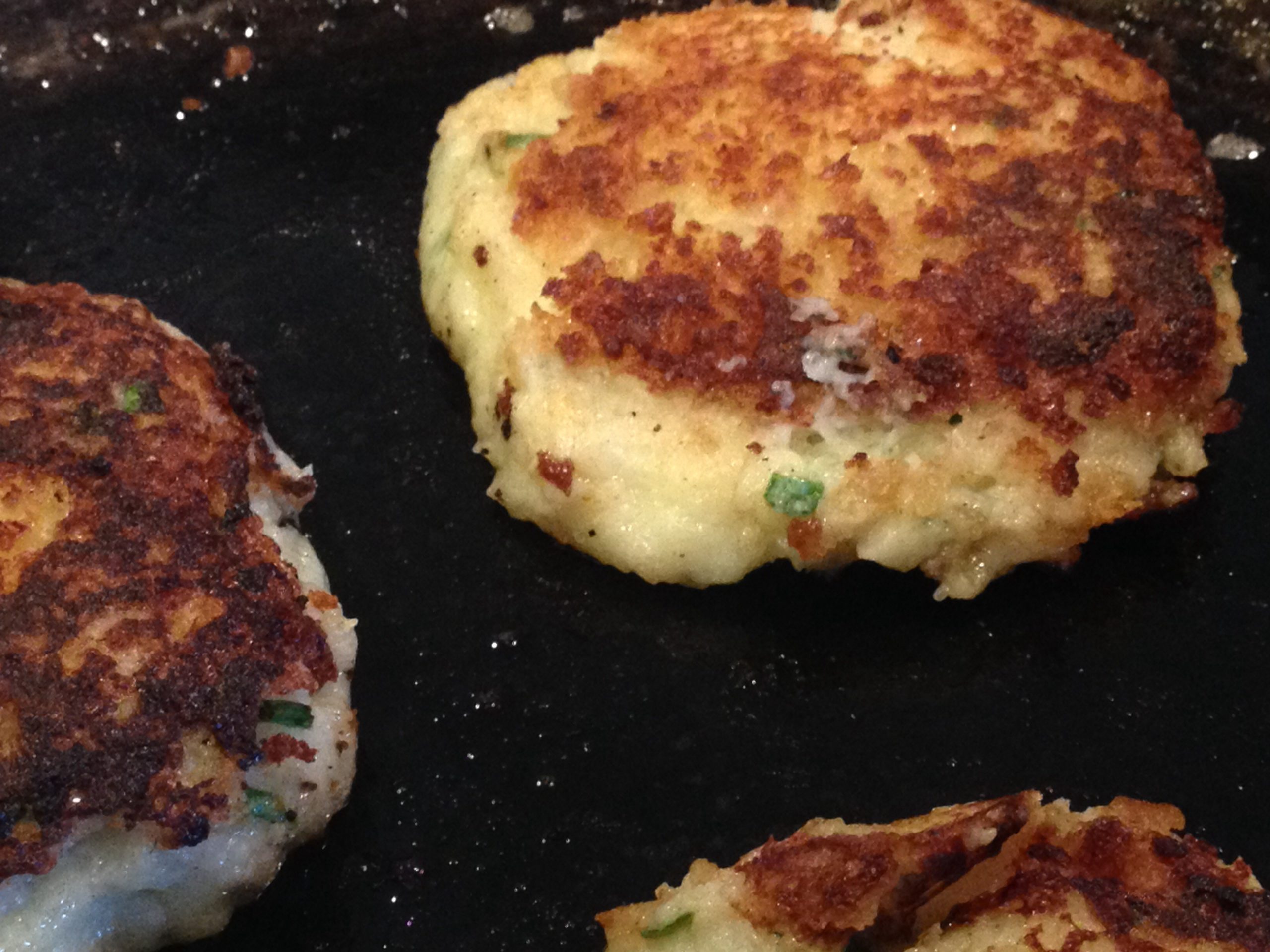 Combine all ingredients except panko in a large bowl and mix thoroughly. Scoop out using ice cream scoop or small bowl onto parchment or waxed paper. Chill at least 30 minutes or up to overnight. Press cool cakes into panko. Brush Evo Grill or cast iron pan with butter over medium heat. Add cakes and griddle about 4 minutes a side or until golden brown and hot. Sprinkle with sea salt and serve straight away or hold in warm oven.