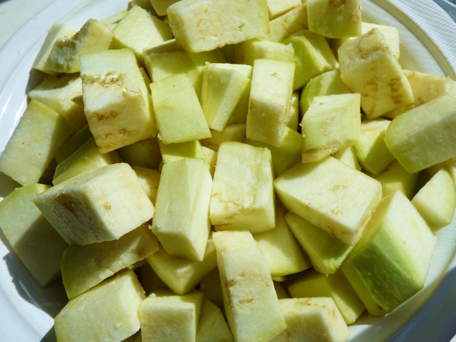 - Use vegetable peeler to remove all skin from 2 medium eggplant. Cube into 1 inch pieces.